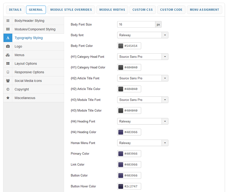 Your template parameters can be access directly from your Template Manager giving you access to a host of features including a selection of template styles, some colour choosers to help customise your template headers and links, a number of layout options and easy to use logo settings.